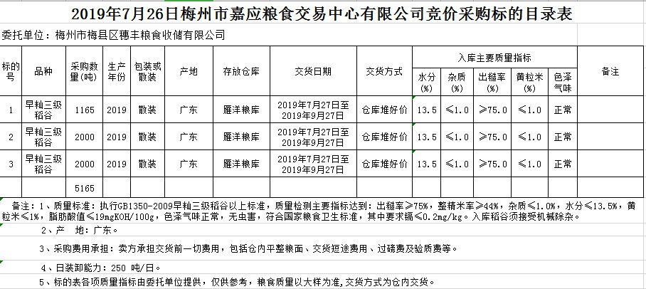 受客戶委托,梅州市嘉應(yīng)糧食交易中心有限公司定于2019年7月26日(星期五)舉辦糧食競價(jià)交易會(huì),梅州市梅縣區(qū)穗豐糧食收儲(chǔ)有限公司擬采購2019年早秈稻5165噸。