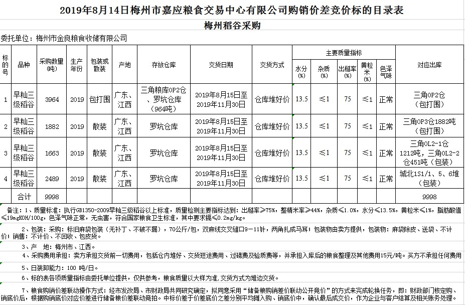 受客戶委托,梅州市嘉應糧食交易中心有限公司定于2019年8月14日(星期三)舉辦稻谷購銷價差聯(lián)動標的交易會,梅州市金良糧食收儲有限公司擬銷售和采購早秈稻9998噸。