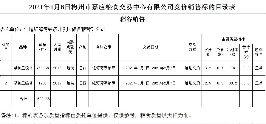 受客戶委托,梅州市嘉應(yīng)糧食交易中心有限公司定于2021年1月6日(星期三)舉辦糧食競(jìng)價(jià)交易會(huì),汕尾紅海灣經(jīng)濟(jì)開(kāi)發(fā)區(qū)儲(chǔ)備糧管理公司擬銷售2018年早秈三級(jí)稻谷468.68噸;2019年早秈三級(jí)稻谷1231噸。