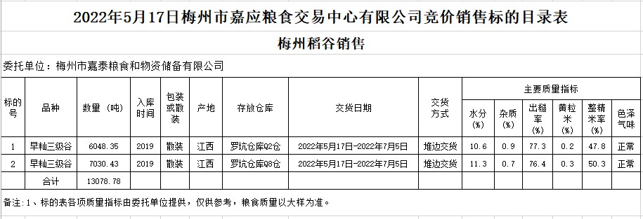 受客戶委托,梅州市嘉應(yīng)糧食交易中心有限公司定于2022年5月17日(星期二)舉辦糧食競(jìng)價(jià)交易會(huì)。梅州市嘉泰糧食和物資儲(chǔ)備有限公司擬銷(xiāo)售2019年早秈稻13078.78噸。