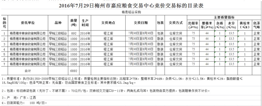 受客戶委托,梅州市嘉應(yīng)糧食交易中心有限公司定于2016年7月29日舉辦糧食競價(jià)交易會(huì),梅州市梅縣區(qū)穗豐糧食收儲(chǔ)有限公司擬采購2016年產(chǎn)早秈三級稻谷6892噸。