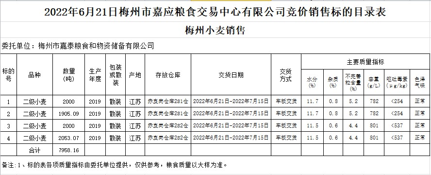 受客戶委托,梅州市嘉應糧食交易中心有限公司定于2022年6月21日(星期二)舉辦糧食競價交易會。梅州市嘉泰糧食和物資儲備有限公司擬銷售2019年小麥7958.16噸。