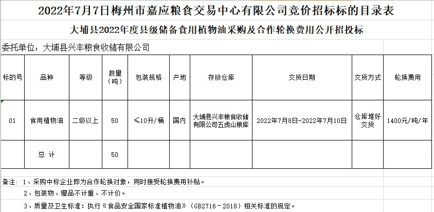 大埔縣2022年度縣級(jí)儲(chǔ)備食用植物油采購(gòu)及合作輪換費(fèi)用公開(kāi)招投標(biāo)公告