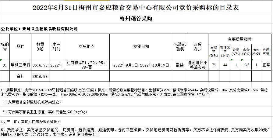 2022年8月31日蕉嶺縣金穗糧食收儲有限公司稻谷采購