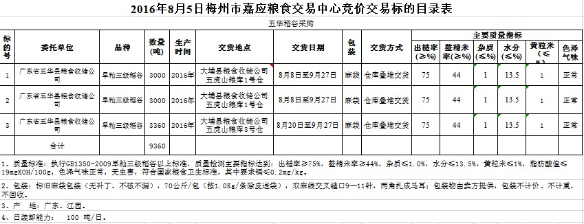 受客戶委托,梅州市嘉應(yīng)糧食交易中心有限公司定于2016年8月5日舉辦糧食競價交易會,廣東省五華縣糧食收儲公司擬采購2016年產(chǎn)早秈三級稻谷9360噸。