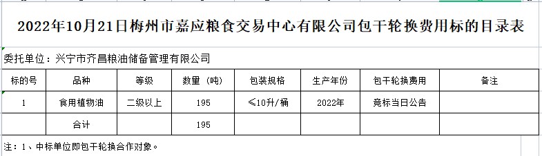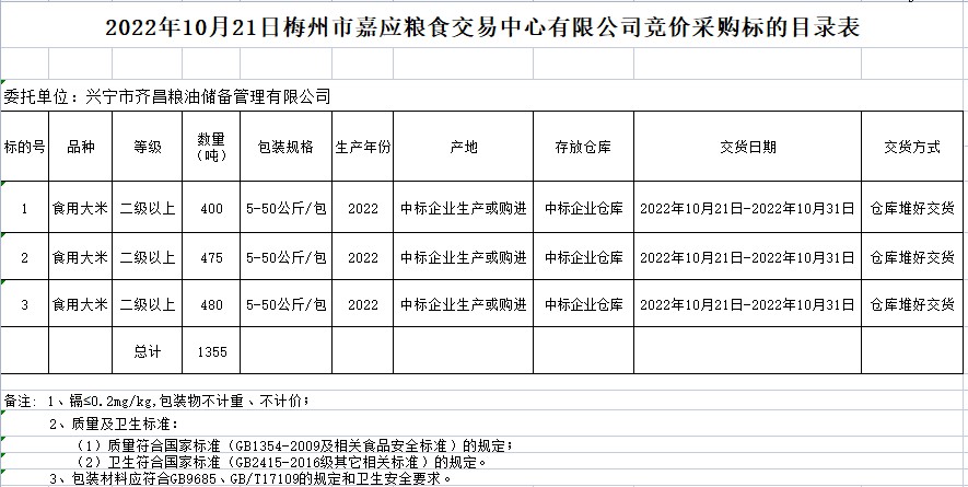受客戶委托,梅州市嘉應(yīng)糧食交易中心有限公司定于2022年10月21日(星期五)上午10時(shí)在廣東省梅州市彬芳大道南161號梅州市糧食交易中心3樓,舉辦興寧市本級成品糧油動(dòng)態(tài)儲(chǔ)備競價(jià)采購及包干輪換費(fèi)用公開招標(biāo)。