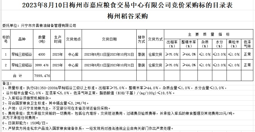 受客戶委托,梅州市嘉應(yīng)糧食交易中心有限公司定于2023年8月10日(星期四)舉辦糧食競價交易會。興寧市齊昌糧油儲備管理有限公司擬采購2023年早秈稻7999.476噸。