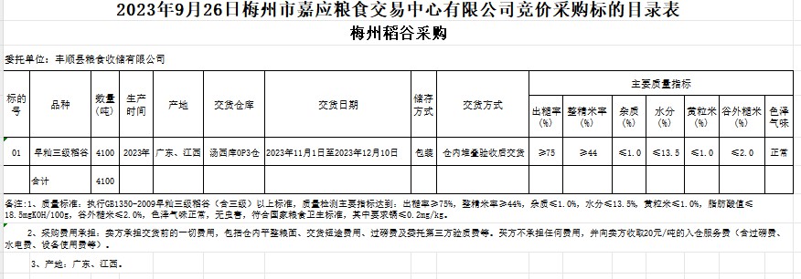 受客戶委托,梅州市嘉應(yīng)糧食交易中心有限公司定于2023年9月26日(星期二)舉辦糧食競(jìng)價(jià)交易會(huì)。豐順縣糧食收儲(chǔ)有限公司擬采購(gòu)2023年早秈稻谷4100噸。