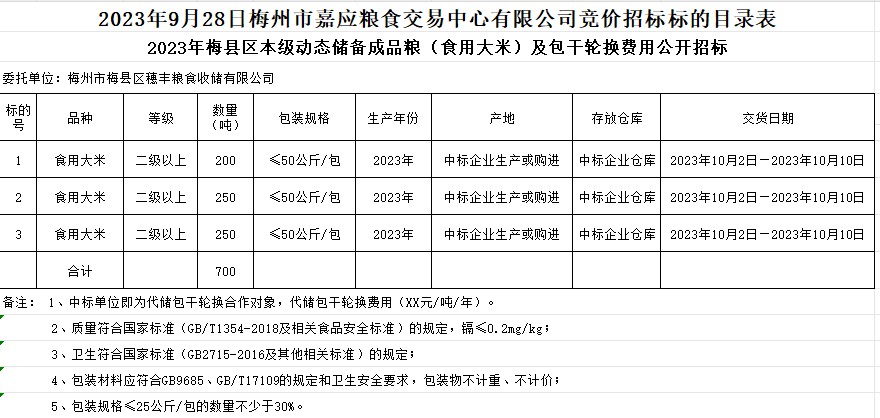 受客戶委托,梅州市嘉應(yīng)糧食交易中心有限公司定于2023年9月28日(星期四)上午10時在廣東省梅州市彬芳大道南161號梅州市糧食交易中心3樓,舉辦梅縣區(qū)本級動態(tài)儲備成品糧采購及包干輪換費用公開招標。