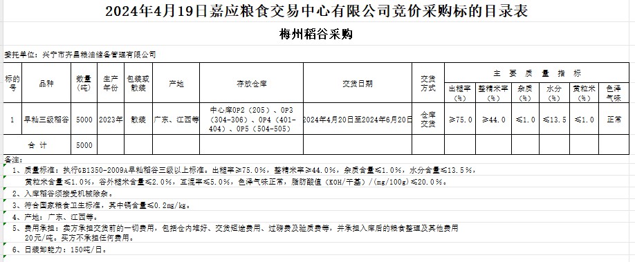 受客戶委托,梅州市嘉應(yīng)糧食交易中心有限公司定于2024年4月19日(星期五)舉辦糧食競價交易會。興寧市齊昌糧油儲備管理有限公司擬采購2023年產(chǎn)早秈稻5000噸。