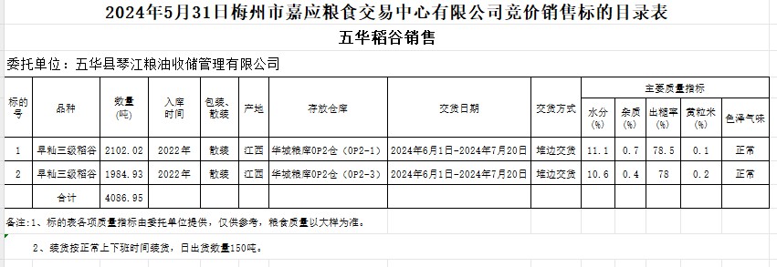 受客戶委托,梅州市嘉應(yīng)糧食交易中心有限公司定于2024年5月31日(星期五)舉辦糧食競(jìng)價(jià)交易會(huì)。五華縣琴江糧油收儲(chǔ)管理有限公司擬銷售2022年產(chǎn)早秈稻4086.95噸。