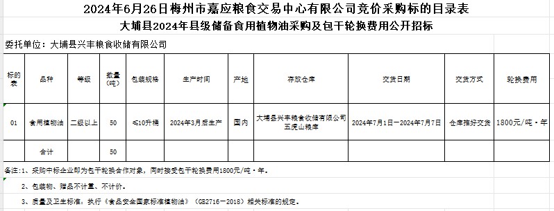 大埔縣2024年縣級儲備食用植物油采購及包干輪換費(fèi)用公開招標(biāo)公告