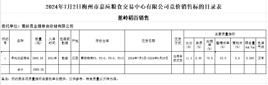 受客戶委托,梅州市嘉應(yīng)糧食交易中心有限公司定于2024年7月2日(星期二)舉辦糧食競價交易會。蕉嶺縣金穗糧食收儲有限公司擬銷售2021年產(chǎn)早秈稻谷3060.28噸。
