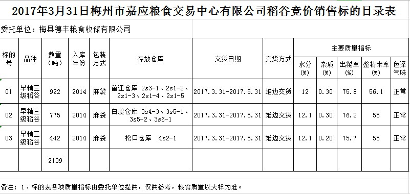 受客戶委托,梅州市嘉應糧食交易中心有限公司定于2017年3月31日舉辦糧食競價交易會,梅州市梅縣區(qū)穗豐糧食收儲有限公司擬銷售早秈三級稻谷2139噸。