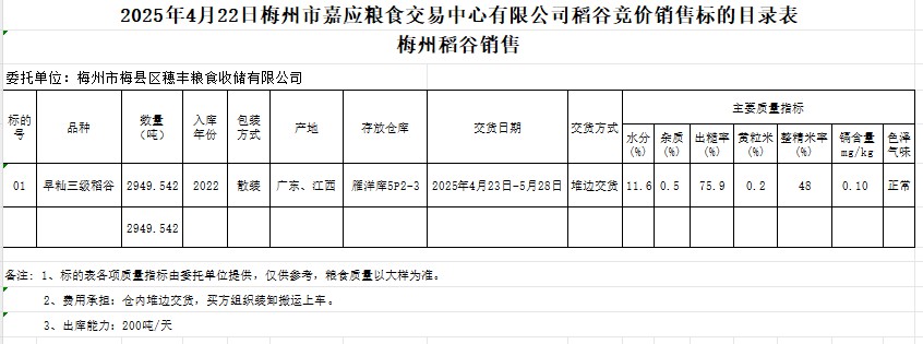 受客戶委托,梅州市嘉應(yīng)糧食交易中心有限公司定于2025年4月22日(星期二)舉辦糧食競價交易會。梅州市梅縣區(qū)穗豐糧食收儲有限公司擬銷售2022年產(chǎn)早秈稻谷2949.542噸。