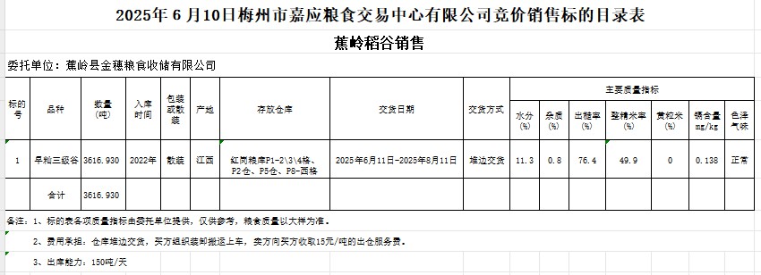 受客戶委托,梅州市嘉應(yīng)糧食交易中心有限公司定于2025年6月10日(星期二)舉辦糧食競價(jià)交易會(huì)。蕉嶺縣金穗糧食收儲(chǔ)有限公司擬銷售2022年產(chǎn)早秈稻谷3616.930噸。