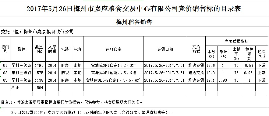 受客戶委托,梅州市嘉應糧食交易中心有限公司定于2017年5月26日舉辦糧食競價交易會,梅州市嘉泰糧食收儲公司擬銷售早秈三級稻谷4504噸。