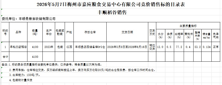 受客戶委托,梅州市嘉應糧食交易中心有限公司定于2026年5月7日(星期四)舉辦糧食競價交易會。豐順縣糧食收儲有限公司擬銷售2023年產(chǎn)早秈稻谷4100噸。
