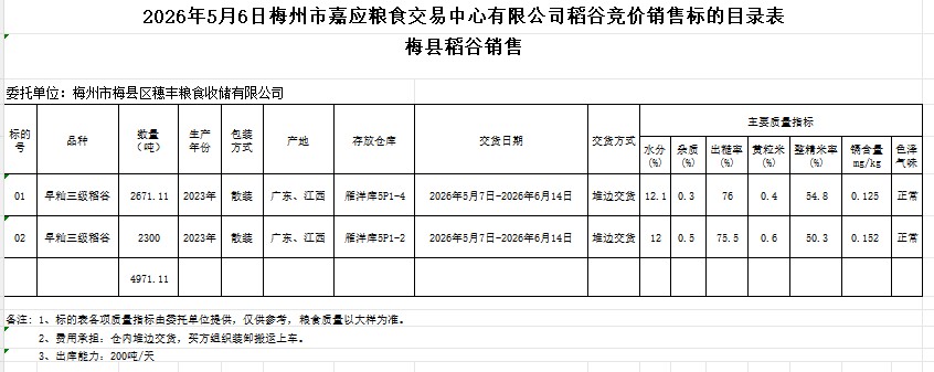 文件下載:2026年5月6日梅州市梅縣區(qū)穗豐糧食收儲有限公司稻谷銷售