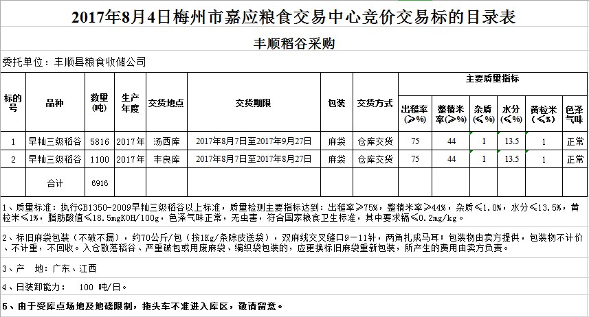 受客戶委托,梅州市嘉應(yīng)糧食交易中心有限公司定于2017年8月4日舉辦糧食競(jìng)價(jià)交易會(huì),豐順縣糧食收儲(chǔ)公司擬采購2017年早秈三級(jí)稻谷共6916噸。