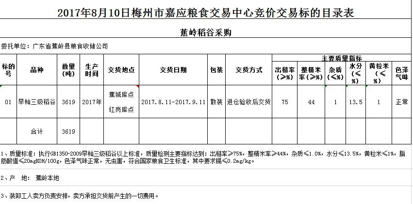 受客戶委托,梅州市嘉應(yīng)糧食交易中心有限公司定于2017年8月10日舉辦糧食競價(jià)交易會(huì),廣東省蕉嶺縣糧食收儲(chǔ)公司擬采購2017年早秈三級(jí)稻谷共3619噸。