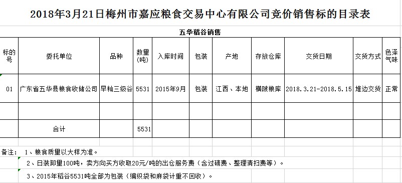受客戶(hù)委托,梅州市嘉應(yīng)糧食交易中心有限公司定于2018年3月21日(星期三)舉辦糧食競(jìng)價(jià)交易會(huì),廣東省五華縣糧食收儲(chǔ)公司擬銷(xiāo)售早秈稻5531噸。