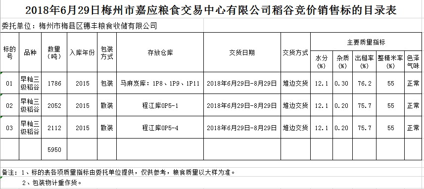 受客戶委托,梅州市嘉應(yīng)糧食交易中心有限公司定于2018年6月29日(星期五)舉辦糧食競價(jià)交易會(huì),梅州市梅縣區(qū)穗豐糧食收儲(chǔ)有限公司擬銷售早秈稻5950噸。